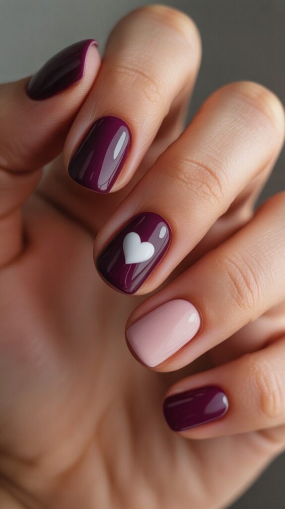 Rich plum-red short squoval nails meet a single accent nail with a crisp white heart — bold yet refined, modern yet romantic. The high-gloss finish enhances depth, while the compact shape makes it ideal for typing, hugging, or holding coffee cups with confidence. A sophisticated twist on classic Valentine’s red.