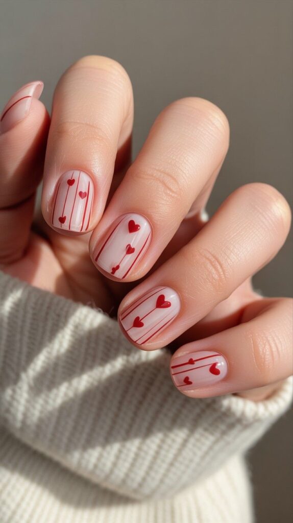Soft nude base meets delicate red vertical stripes and tiny hand-drawn hearts — minimalist, sweet, and effortlessly chic. The clean lines and balanced spacing give it a modern editorial feel, while the short length ensures comfort and durability. Like whispered affection: subtle, intentional, and deeply felt.