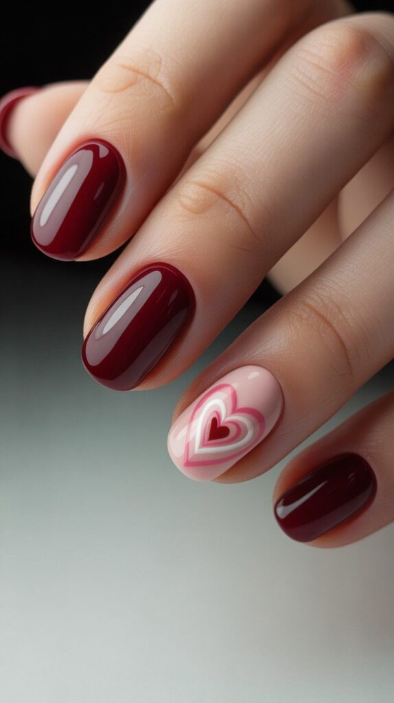 Rich burgundy short almond nails with one nude accent finger featuring a delicate nested-heart motif — red inside white inside pink — like love unfolding in layers. The high-shine finish enhances the soft gradient effect, and the compact shape keeps it elegant and practical. Sweet, sophisticated, and deeply intentional.
