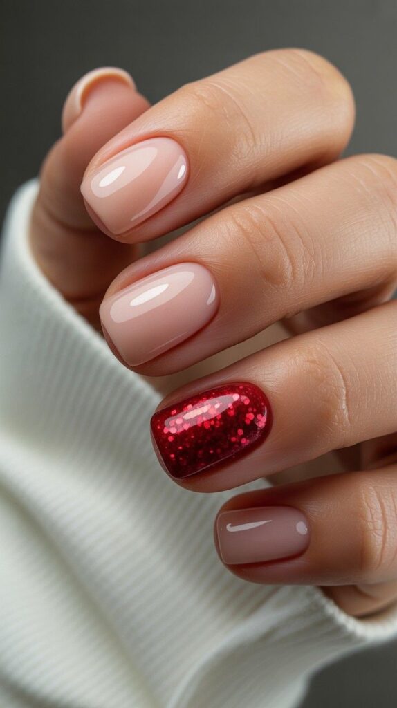 Soft blush-pink short almond nails with one bold red glitter accent nail — classic Valentine’s energy, reimagined for real life. The high-shine glitter is finely milled (no chunky fallout), and the short length ensures it stays flawless through typing, texting, and hugging. Bold enough to shine, soft enough to wear every day.
