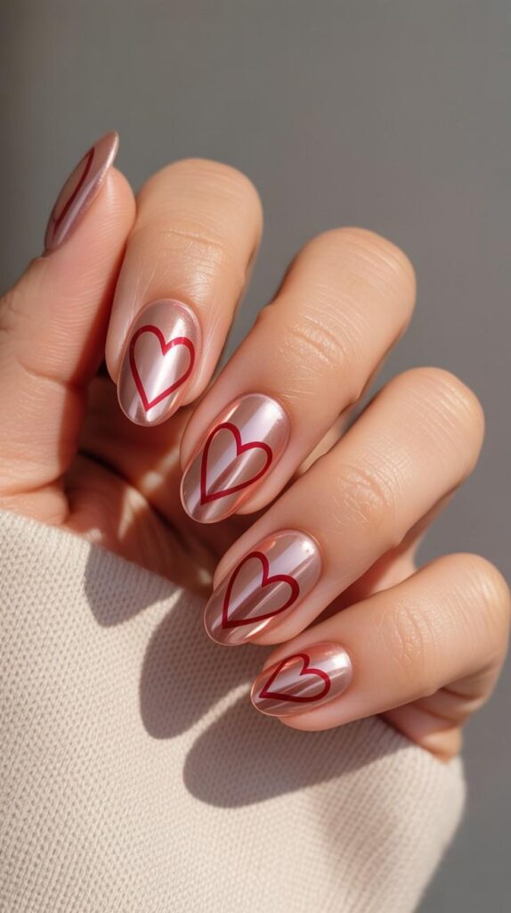 Luminous rose-gold sheer polish with elegant red outline hearts — soft metallic warmth meets classic romance. The subtle shimmer catches light beautifully, and the short rounded-square shape frames the hand with gentle sophistication. No glitter, no fuss — just pure, wearable love.
