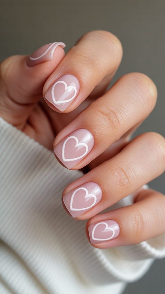 Soft blush-pink short rounded-square nails adorned with clean white heart outlines — minimalist, airy, and refreshingly modern. The negative-space design feels light and contemporary, while the glossy finish adds polish (literally!). Ideal for those who love love—but prefer it whispered, not shouted.