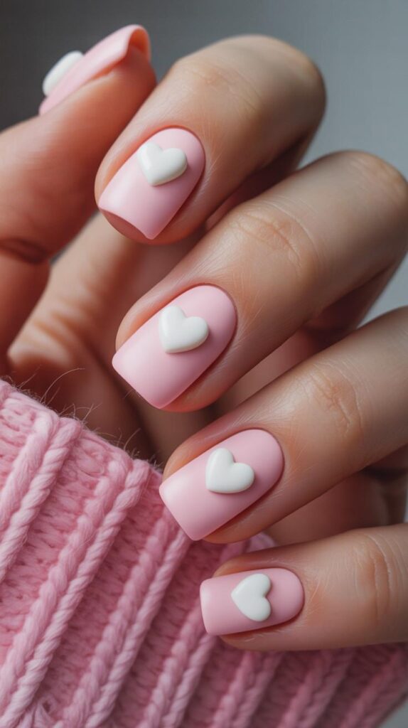 Matte-finish soft pink short nails with raised 3D white hearts — tactile, tender, and irresistibly sweet. The contrast between matte texture and smooth, dimensional hearts creates lovely depth, and the short length makes this design surprisingly durable. Love you in person — literally.