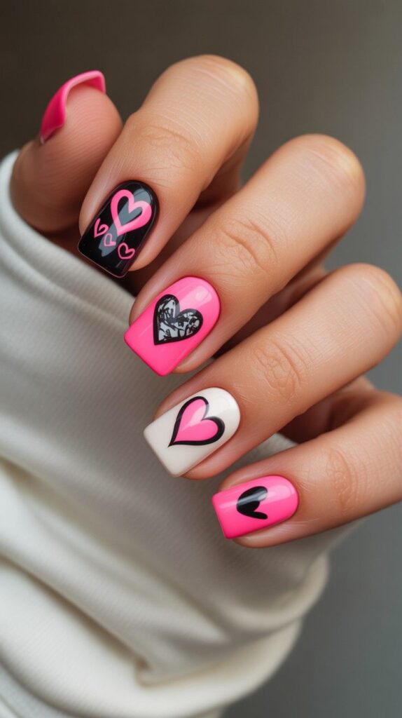 Short almond nails in vibrant pink, black, and creamy white — each finger tells a mini love story with layered hearts: outlined, filled, sketched, and dotted. Playful, graphic, and full of personality, this design feels like a love letter drawn in nail art. The glossy finish keeps it polished, not chaotic.