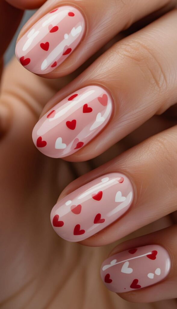 Delicate blush-pink short nails covered in scattered red and white hearts — joyful, youthful, and full of movement. The glossy finish adds dimension without heaviness, and the short length makes this design surprisingly resilient. Like confetti caught mid-fall: spontaneous, sweet, and full of life.