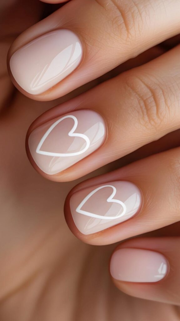 Creamy nude short almond nails feature clean white heart outlines — minimalist, serene, and deeply calming. The negative-space design feels contemporary and intentional, while the high-gloss finish adds polish without weight. Like a whispered “I care” — gentle, true, and always in style.