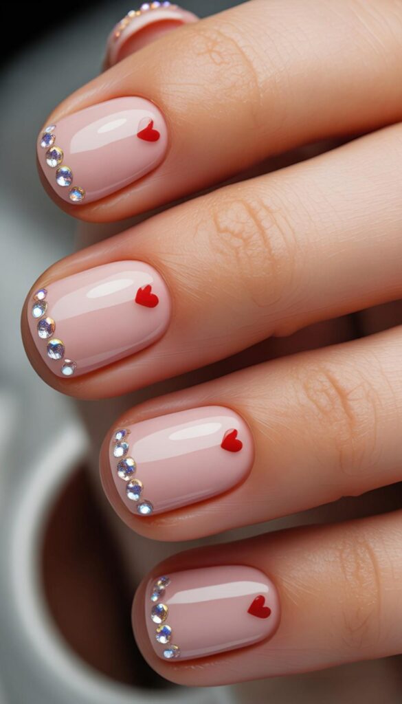 Creamy nude short nails feature a delicate curve of iridescent rhinestones along the cuticle + one tiny red heart on each accent finger — luxe, playful, and perfectly balanced. The sparkle catches light subtly, never overwhelming, and the short length makes this design surprisingly durable. Love, elevated.