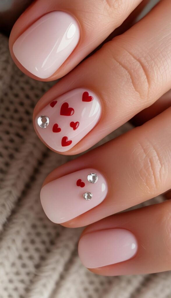 Smooth nude short rounded-square nails feature one accent finger with mini red hearts + two iridescent rhinestones — luxe, delicate, and perfectly balanced. The sparkle catches light subtly (no blinding glare!), and the compact shape keeps it practical for daily life. Love, polished and precise.