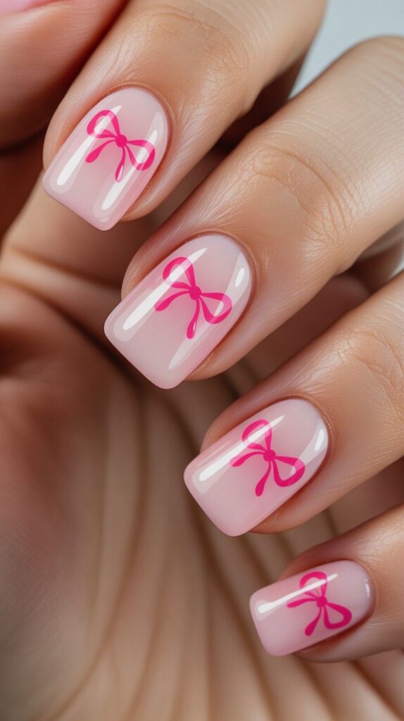 Soft blush-pink short squoval nails adorned with delicate pink bow decals — playful, feminine, and utterly charming. The glossy finish makes the bows pop like ribbon on a gift box, while the compact shape ensures comfort and durability. A sweet nod to romance, without a single sharp edge.