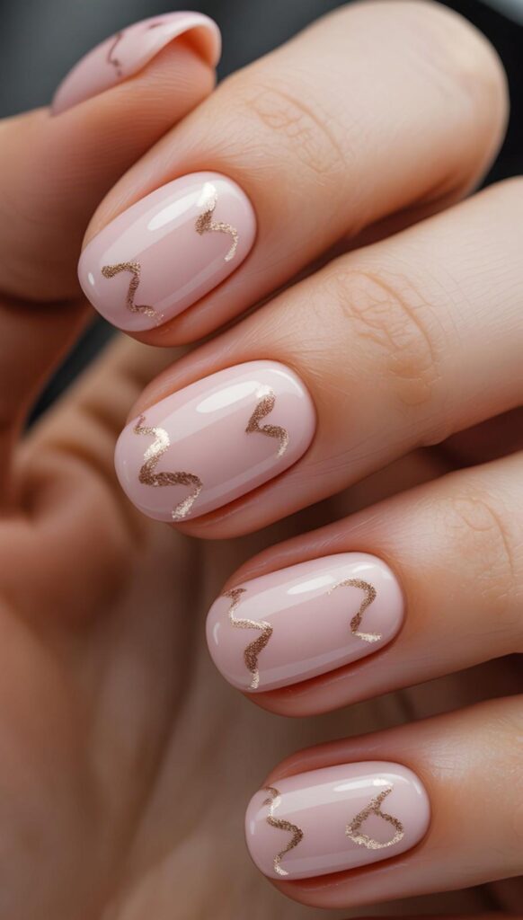 Soft blush-pink short rounded-square nails adorned with delicate gold glitter zigzags — modern, whimsical, and subtly luxe. The hand-painted lines feel like love notes sketched in shimmer, and the low-profile shape keeps it elegant and practical. No glitter fallout, no snagging — just quiet sparkle with intention.