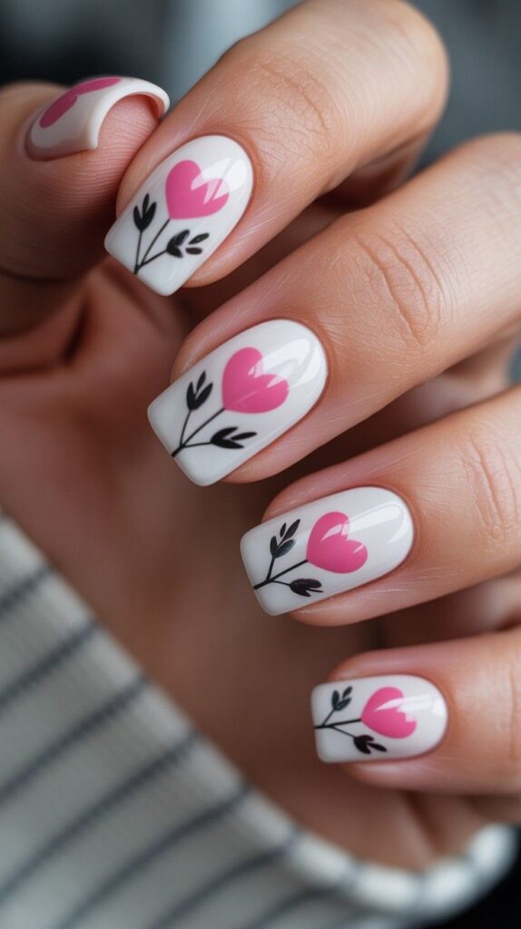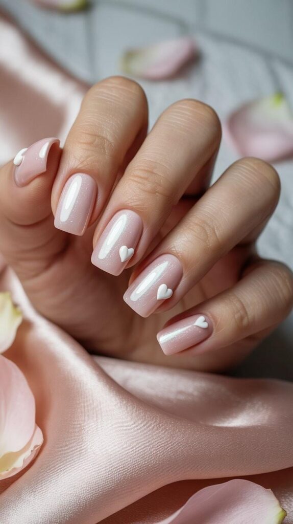 Soft blush pink polish meets delicate white hearts — like a love letter written in miniature. The glossy finish catches every glint of light, making it perfect for cozy nights in or festive gatherings. Paired with satin fabric and rose petals, this design whispers ‘romantic magic’ with every glance.