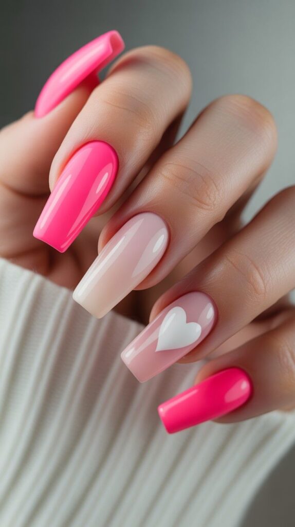 Vibrant neon pink polish meets a single bold white heart on a soft blush base — playful, modern, and perfect for showing off your personality. The glossy finish catches every glint of light, making it ideal for date nights or Galentine’s brunches. Paired with clean stiletto shapes, this design whispers ‘fun + flirty’ with every gesture.