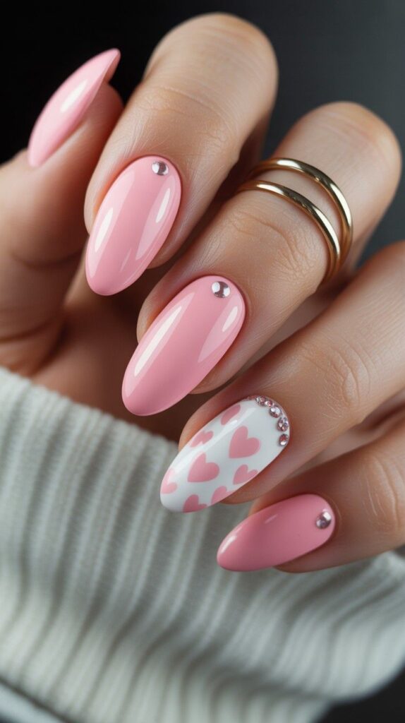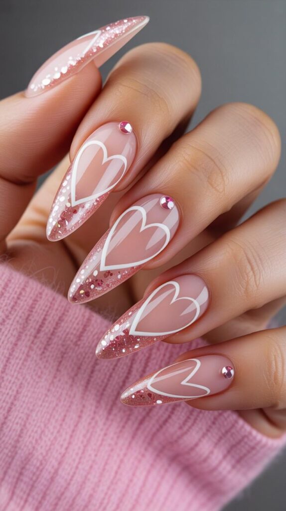 Soft blush pink polish meets crisp white hearts and delicate rhinestones — like a love letter written in nail art. The glossy finish catches every glint of light, making it perfect for cozy nights in or festive gatherings. Paired with a soft knit sweater backdrop, this design whispers ‘romantic magic’ with every glance.