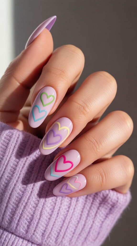 Soft lavender polish meets colorful neon heart outlines — like a rainbow love letter painted on your nails. The glossy finish catches every glint of light, making it perfect for sunny afternoons or springtime selfies. Paired with square stiletto shapes, this design whispers ‘joyful magic’ with every glance.