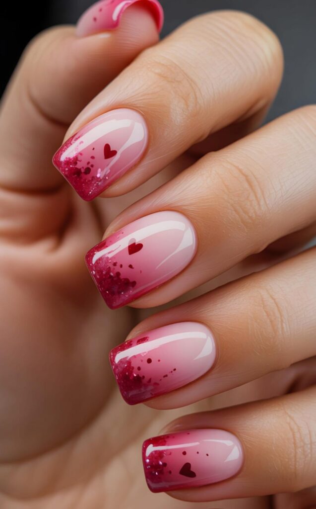 Deep fuchsia fades into soft blush pink, while each nail features delicate glitter hearts — like a winter storm captured in miniature. The glossy finish catches every glint of light, making it perfect for evening events or snowy strolls. Paired with a snowy backdrop, this design whispers ‘cosmic magic’ with every gesture.