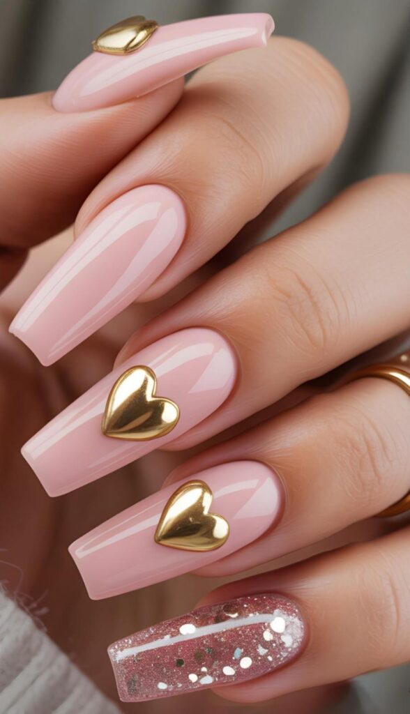 Soft blush pink polish meets sculpted gold hearts — like a celestial love letter painted on your nails. The glossy finish catches every glint of light, making it perfect for romantic dinners or gifting yourself a little cosmic energy. Paired with square stiletto shapes, this design whispers ‘elegant magic’ with every glance.