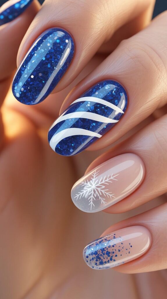 “Deep blue glitter polish gets a playful upgrade with bold white candy cane swirls that dance across each nail — while one accent nail features a giant white snowflake for balance. Tiny glitter dots scattered around mimic falling snow — fun, festive, and totally Instagram-worthy.”