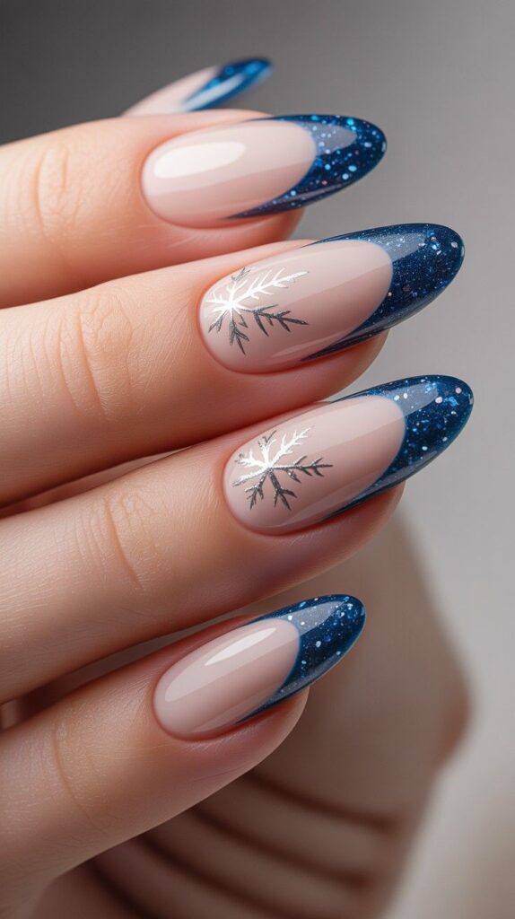 “Glossy nude nails meet luxury with deep blue glitter tips and delicate silver snowflakes that look like they’re floating across the surface. Tiny starbursts scattered around mimic falling stars — clean, graphic, and quietly dramatic.”