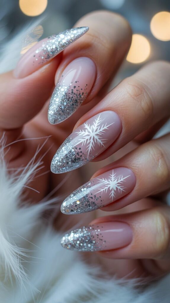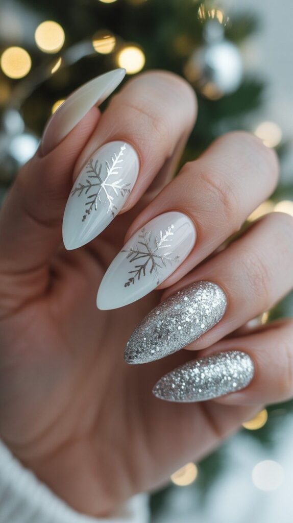 “Long, sharp stiletto nails get a glam upgrade — half covered in dense silver glitter, half left clear to showcase delicate white snowflakes. Tiny gold flecks peek through like hidden stars — bold, sparkly, and totally Instagram-worthy.”