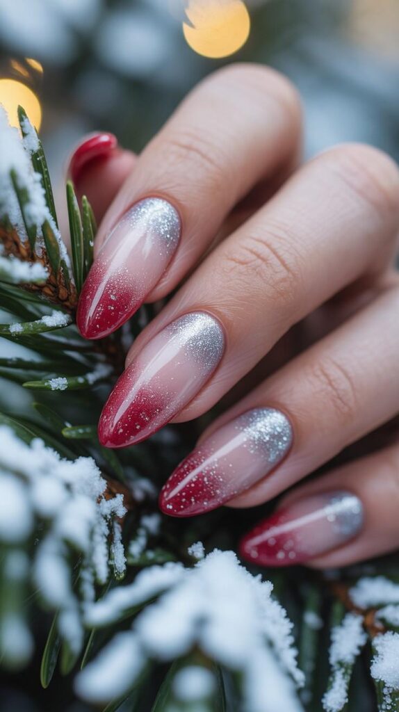 “Crimson tips melt into sheer nude bases, dusted with ultra-fine silver glitter that catches every light — like holiday lights reflecting off snow. The glossy finish makes them pop against pine branches or cozy sweaters.”