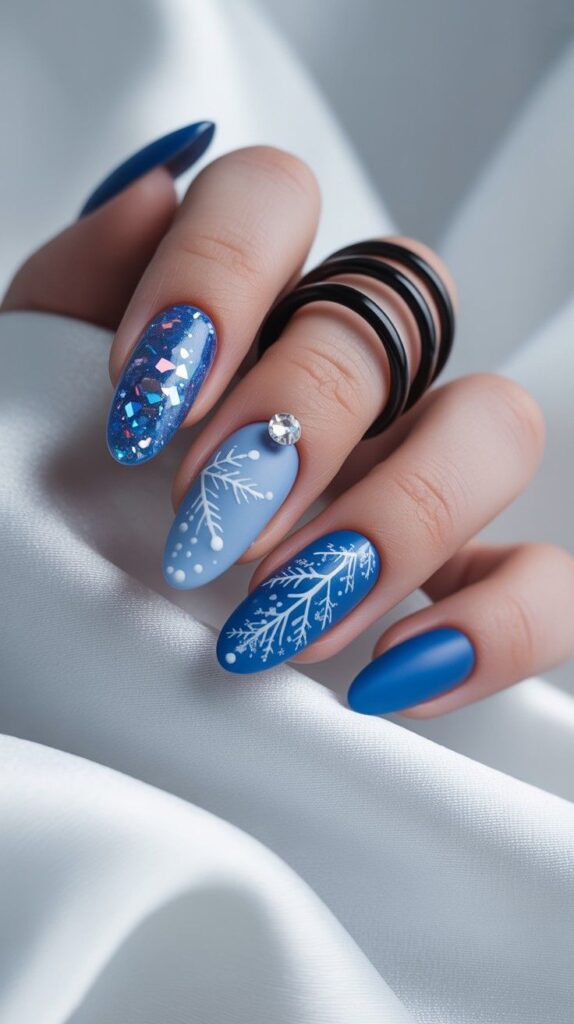 “Deep navy polish frames two accent nails — one with a giant white snowflake, the other a crisp silver glitter fade. The remaining nails? Speckled with snowy white dots for that ‘just walked through a winter wonderland’ feel.”