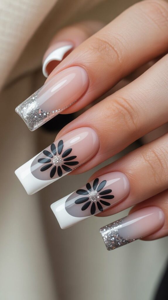 19) Black Daisy Accents on Nude & Glitter