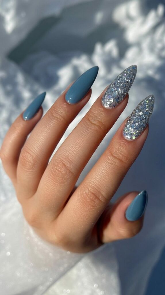 “Long, sharp stiletto nails get a glam upgrade — half covered in dense silver glitter that shimmers like crushed ice, half left in soft dusty blue for contrast. It’s sleek, modern, and totally runway-ready — like wearing a winter art exhibit on your fingertips.”