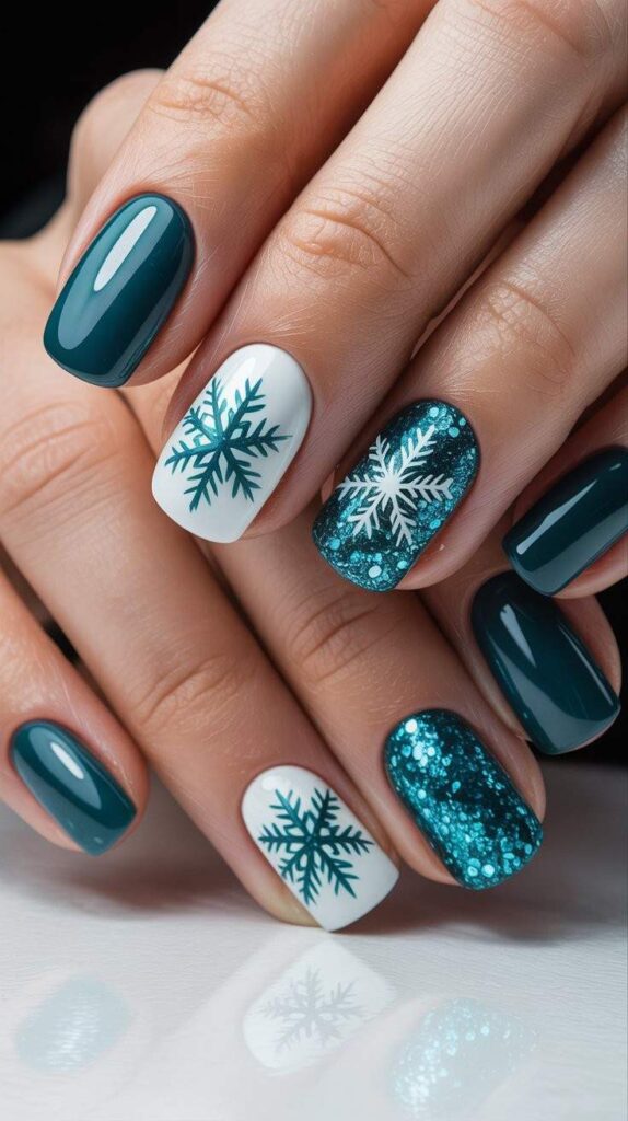 “Rich teal polish frames two accent nails — one with a giant white snowflake, the other a shimmering holographic glitter fade. The remaining nails? Crisp white with delicate teal snowflakes — bold, balanced, and totally photo-worthy.”
