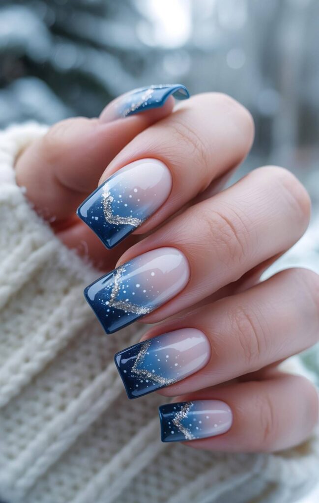 “Glossy deep navy fades into soft lavender at the tips, each nail dusted with shimmering silver glitter that swirls like a crescent moon across the surface. Tiny white dots mimic falling snow — dreamy, celestial, and perfect for winter nights.”
