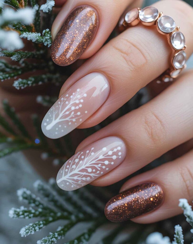 “Rich copper glitter coats two accent nails like molten metal, while the rest feature delicate white branch designs with tiny berry dots — think frosted twigs after a light snowfall. It’s warm, earthy, and totally unexpected for winter.”