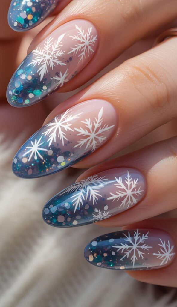 Think icy ombres that glow like moonlight, snowflakes that look hand-painted by a winter fairy, and glitter fades so rich, they’ll catch every camera flash (yes, even your iPhone’s).