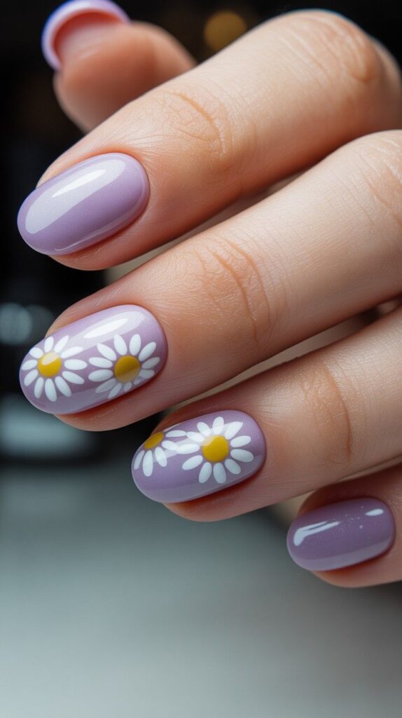 Iridescent lavender-chrome short squoval nails, two accent fingers adorned with hand-painted white daisies (yellow centers) and fine green vine details. The chrome base enhances the vibrancy, and the glossy topcoat seals the art with a liquid-light finish. Playful, poetic, and full of springtime rhythm.