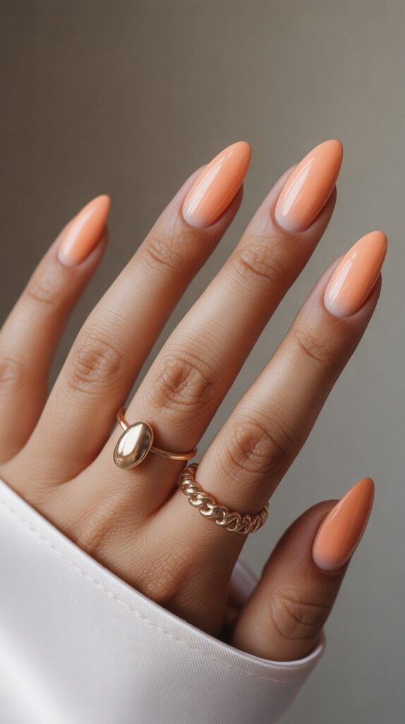 Vibrant glossy coral-chrome short oval nails—warm, luminous, and full of joyful energy. The chrome sheen makes the color glow like sunset light, and the oval shape ensures comfort and elegance through real life. Bold yet balanced—confidence, polished.