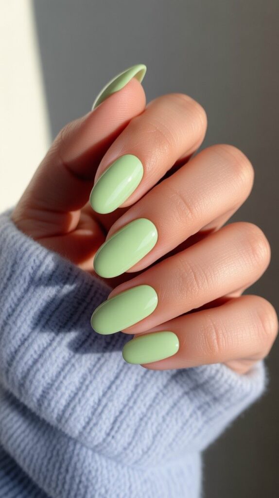 Glossy short almond nails in luminous mint-green chrome finish—smooth, reflective, and full of fresh energy. The high-shine surface catches light like dew on new leaves, and the compact shape ensures all-day wearability. Not icy—sunlit coolness, serene and confident.