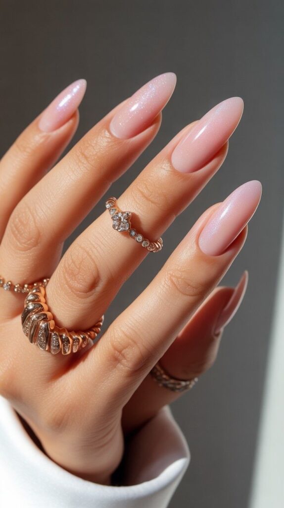 Soft ballet-pink chrome short oval nails—luminous, delicate, and full of ethereal warmth. The chrome finish adds depth without harshness, and the oval shape ensures comfort and elegance through real life. Serene, romantic, and deeply calming—like blush on dawn light.