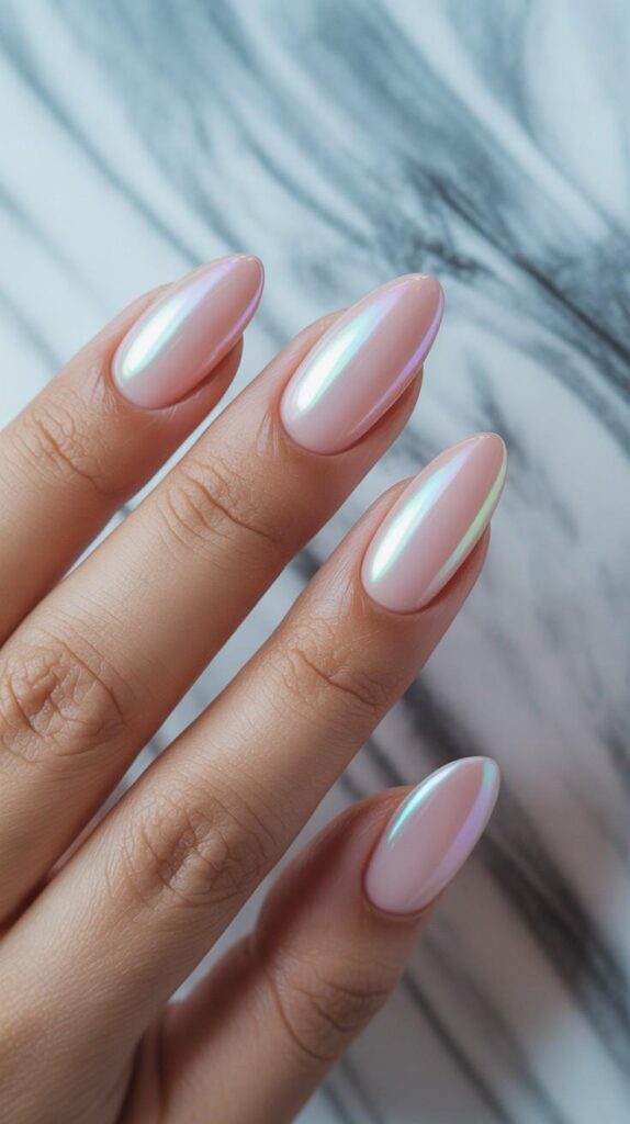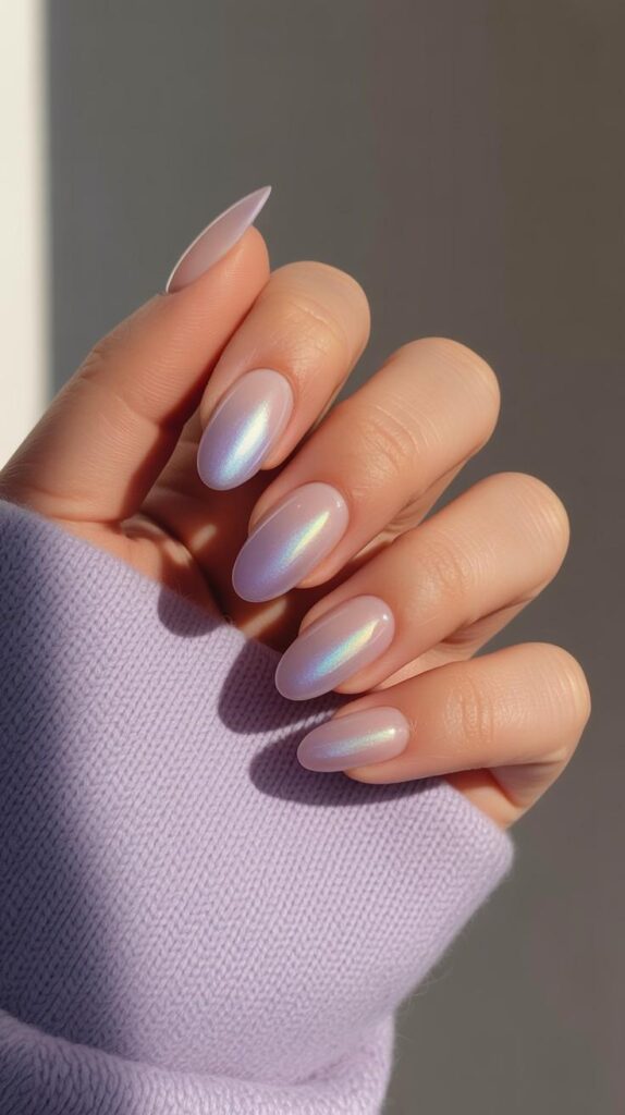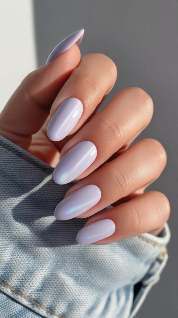 Short oval nails in seamless gradient from sheer pearl-white at the cuticle to soft lilac-chrome at the tip—luminous, dimensional, and ethereal. The chrome sheen adds depth without harshness, and the oval shape elongates and refines. Like morning light on seashell—gentle, radiant, and deeply calming.