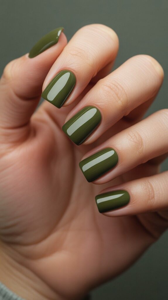 Glossy short square nails in deep olive-green chrome finish—earthy, luminous, and full of grounded sophistication. The high-shine surface reflects light like polished stone, and the crisp square shape ensures elegance and durability. Not muted—richly resonant.