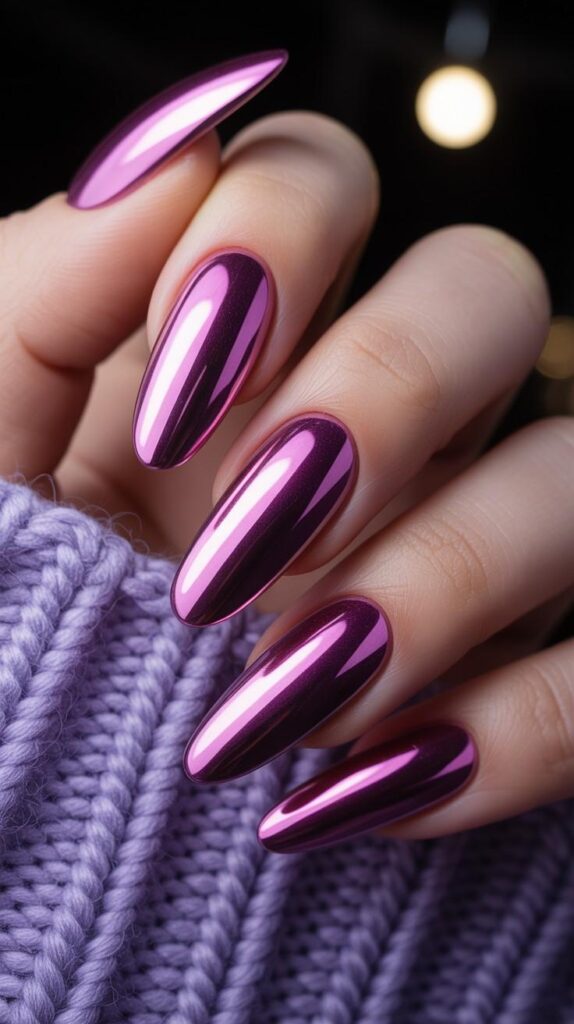 Glossy long stiletto nails in deep magenta-chrome finish—rich, luminous, and full of jewel-toned intensity. The high-shine surface mirrors light like polished amethyst, and the sharp shape elongates with quiet confidence. Not aggressive—radiantly regal.
