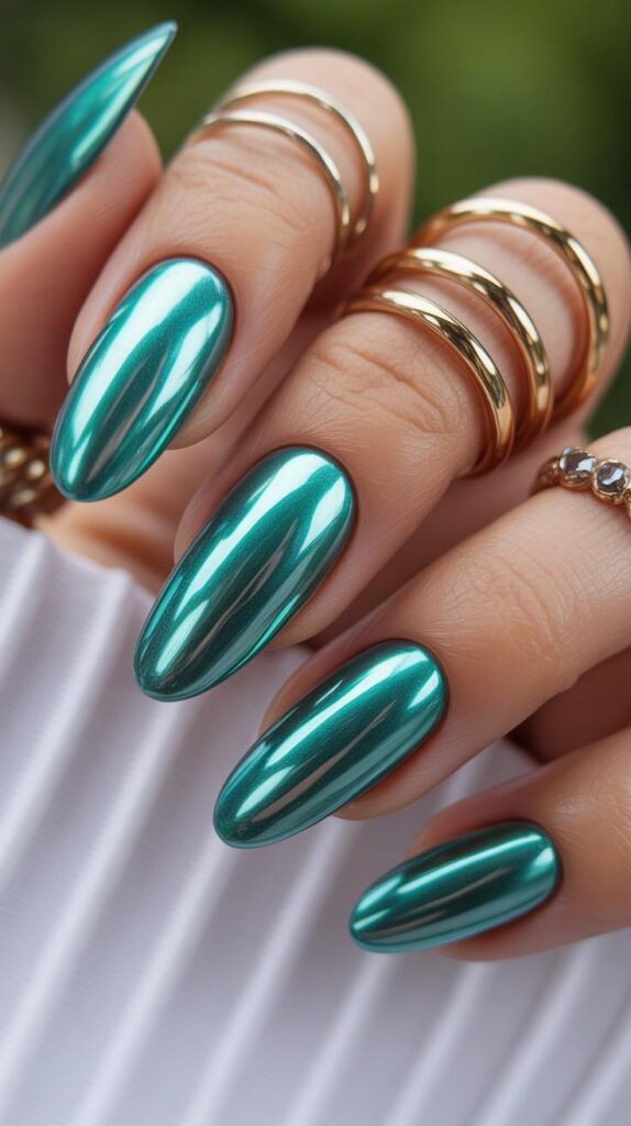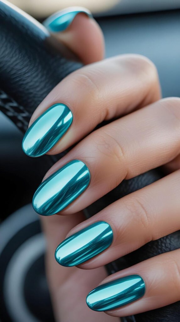 Vibrant glossy teal-chrome long stiletto nails—bold, reflective, and full of oceanic energy. The high-shine surface mirrors light like sea glass, and the sharp shape commands presence with grace. Not loud—joyfully magnetic.