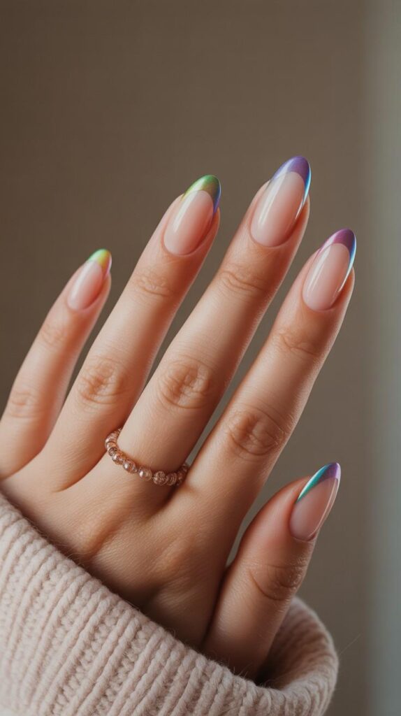 Sheer nude-chrome short square nails with crisp French tips transitioning through iridescent violet → teal → lime green—fluid, futuristic, and full of spring energy. The chrome finish unifies the palette, and the crisp square shape ensures modern sophistication. Not flashy—harmoniously radiant.*