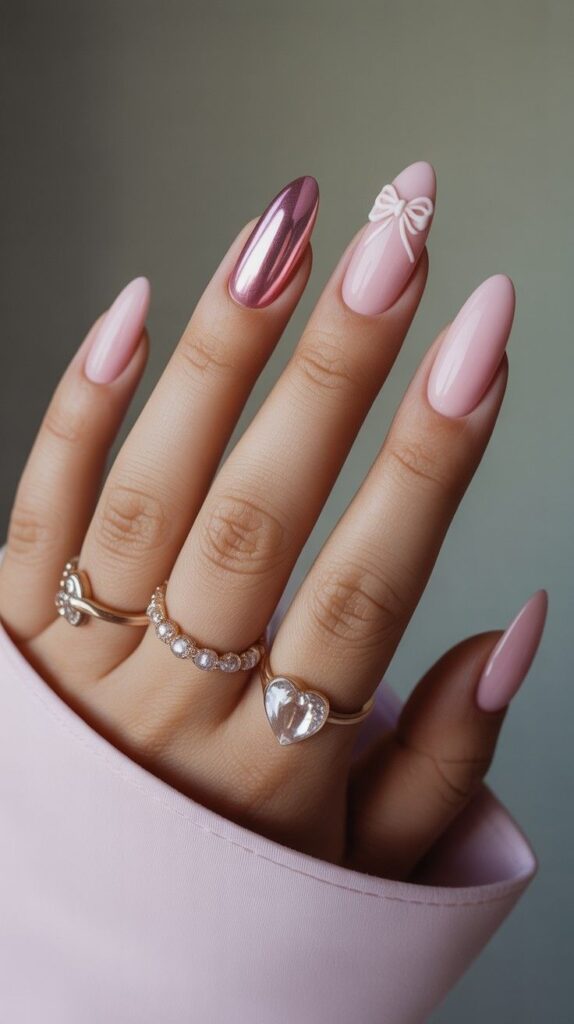 Soft ballet-pink chrome short squoval nails, one accent finger featuring a raised 3D white bow with delicate gold-thread detailing. The metallic base enhances the sweetness, and the glossy topcoat seals the texture with liquid light. Romantic, playful, and deeply intentional—joy made tactile.