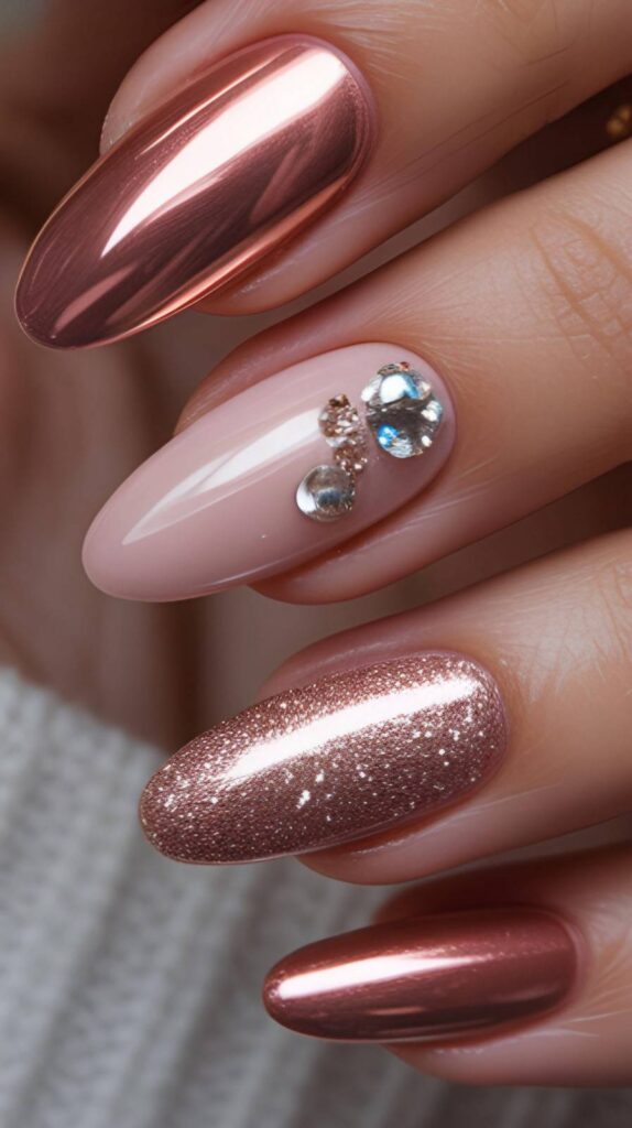 Warm rose-gold chrome short squoval, one accent finger adorned with scattered micro-crystals (clear, blue, and champagne) for delicate sparkle. The metallic base grounds the shimmer, and the glossy topcoat seals the texture with liquid light. Elegant, earthy, and deeply luxurious.