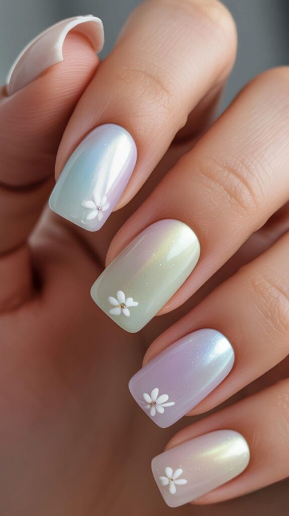 Sheer nuderome short squoval nails, two accent fingers featuring hand-painted white daisies (yellow centers), fine green vines, and a sweep of iridescent green shimmer. The chrome base amplifies the delicacy, and the compact shape ensures all-day comfort. Poetic, fresh, and full of springtime rhythm.