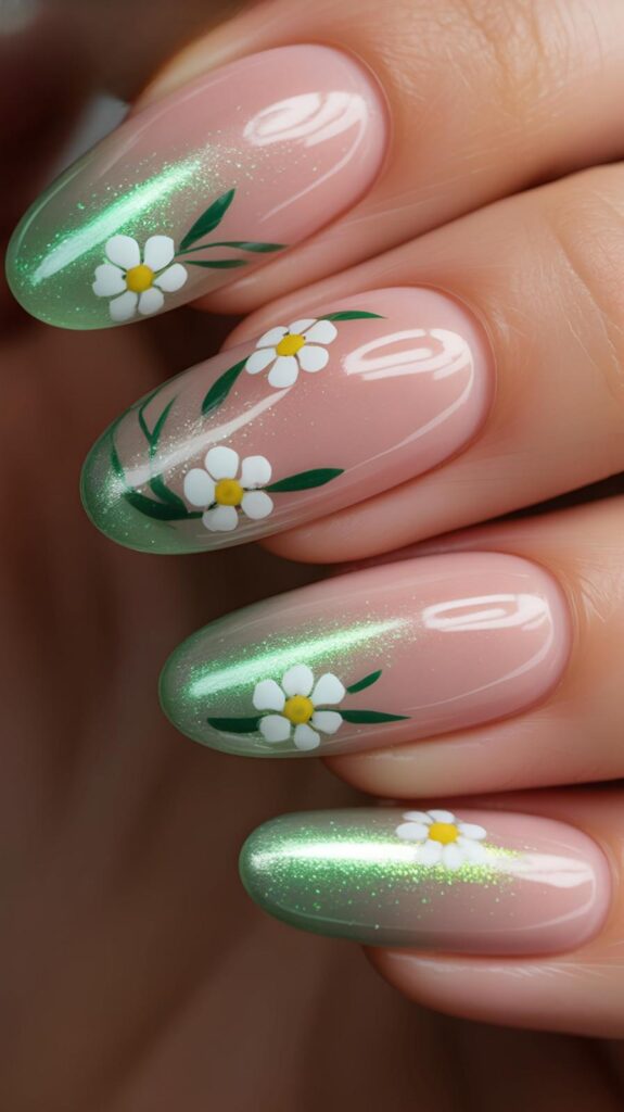 Sheer nude-chrome short almond nails, two accent fingers featuring hand-painted white daisies (yellow centers), fine green vines, and a sweep of iridescent green shimmer at the tip. The chrome base enhances the vibrancy, and the elongated shape flatters every hand. Tender, poetic, and full of springtime joy—like a garden reflected in light.