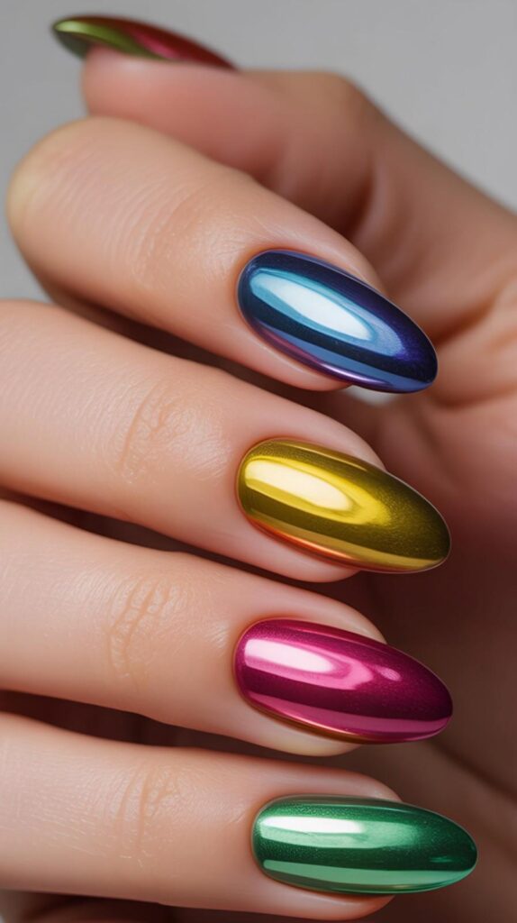 Short almond nails in seamless gradient from emerald-chrome → gold-chrome → violet-chrome → magenta-chrome—vibrant, fluid, and full of prismatic energy. The chrome finish unifies the spectrum, and the elongated shape enhances dimension without fragility. Not flashy—harmoniously electric.