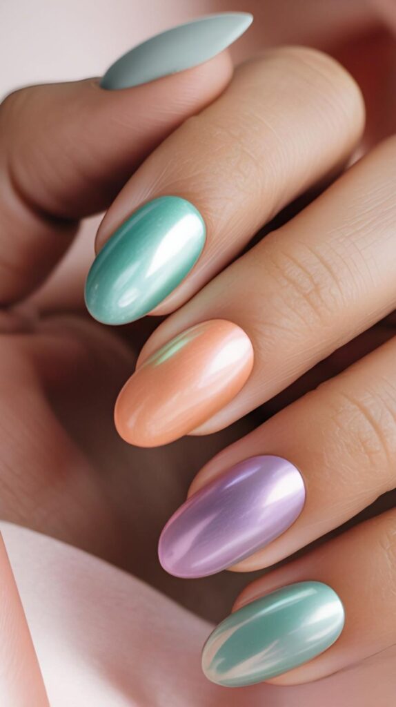 Short almond nails in seamless gradient trio: mint-chrome → peach-chrome → lilac-chrome—fluid, dreamy, and full of seasonal harmony. The chrome sheen unifies the palette, and the elongated shape enhances dimension. Like sunrise captured in polish: gentle, radiant, and deeply wearable.