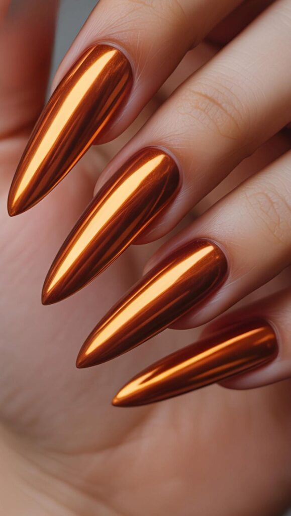 Bold glossy copper-chrome long stiletto nails—warm, reflective, and full of molten-sun intensity. The high-shine surface mirrors light like polished bronze, and the sharp shape commands presence with grace. Not aggressive—radiantly sovereign.