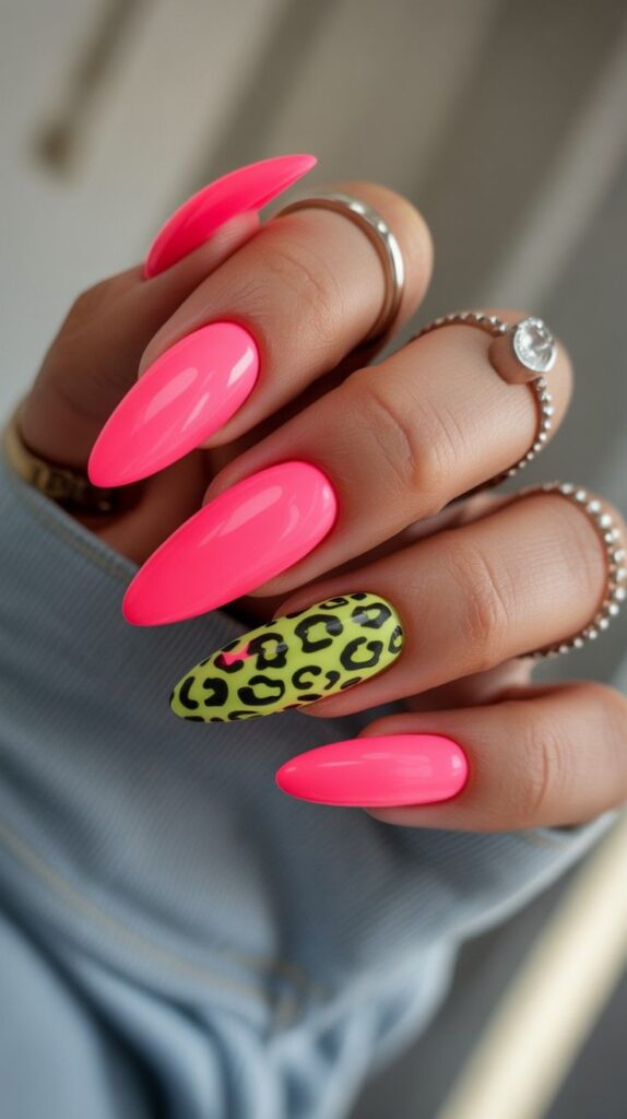 Vibrant glossy hot-pink long stiletto nails, one accent finger featuring a bold lime-green base with black leopard-print pattern and a tiny pink heart detail. The high-shine finish makes the contrast pop, and the sharp shape commands presence. Not loud—just unapologetically alive.