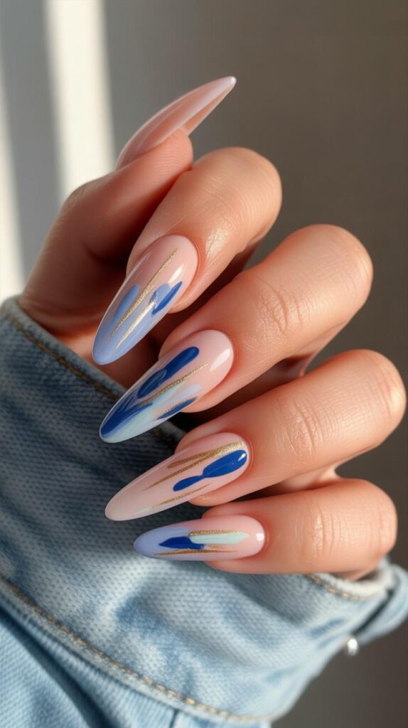 Sheer nude-pink almond nails with fluid hand-painted blue brushstrokes (navy to sky), accented with fine gold metallic lines and micro-dots. The glossy finish unifies the art, and the elongated shape adds modern sophistication. Not random—curated energy.