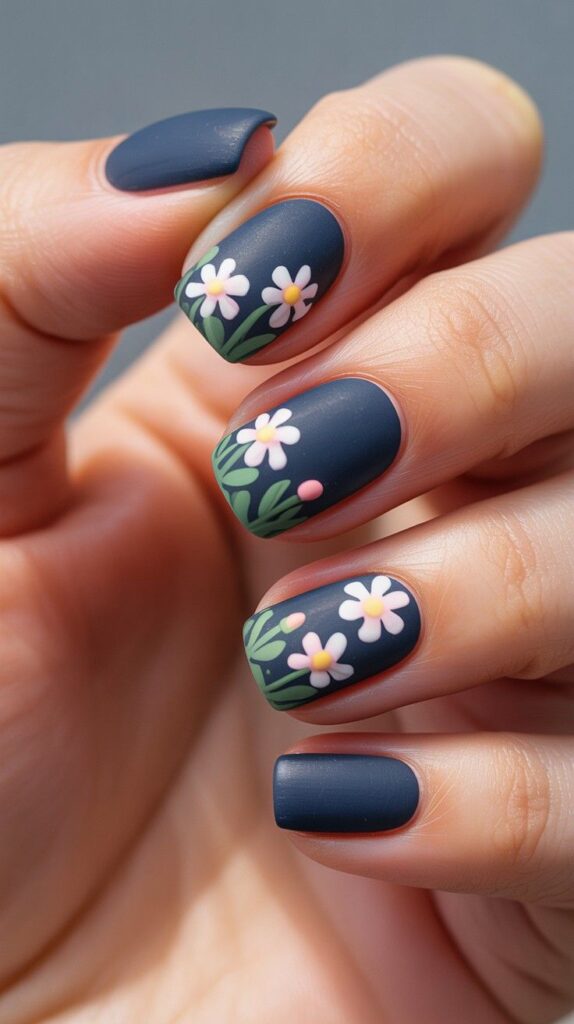 Matte deep navy short squoval nails, two accent fingers featuring raised 3D white daisies with pink centers and delicate green vines. The satin finish grounds the vibrancy, and the compact shape ensures all-day wearability. Moody yet sweet—like twilight blooming into dawn.